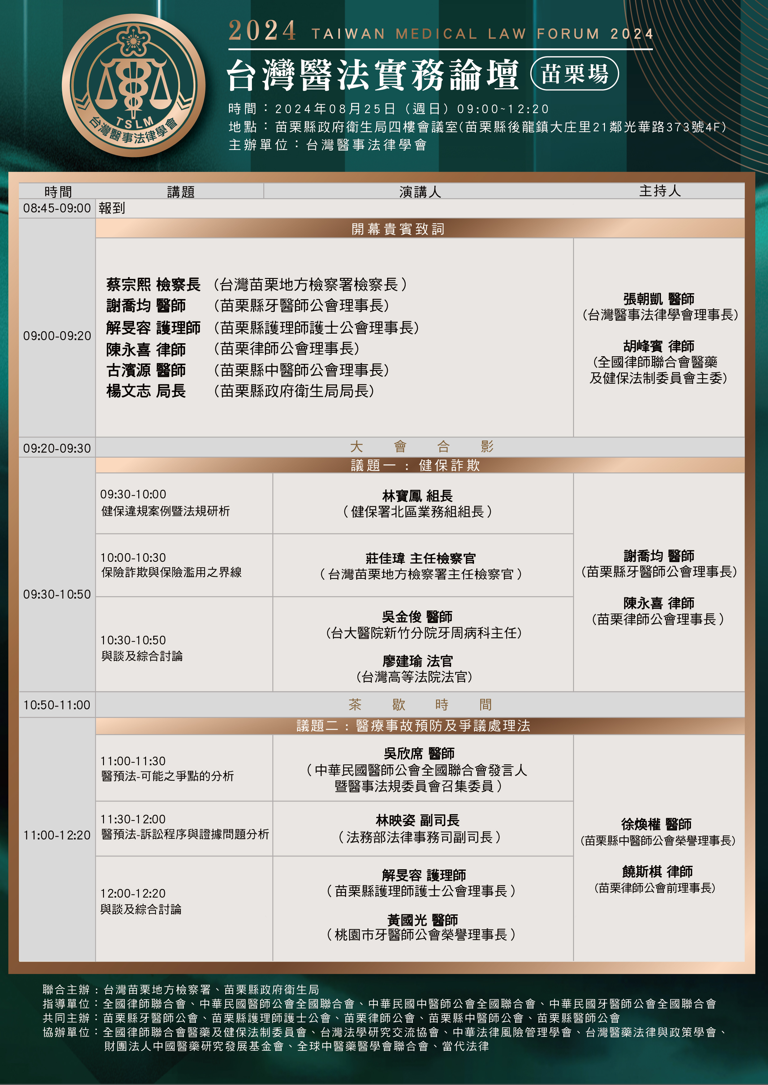 台灣醫事法律學會與苗栗地檢署、苗栗縣衛生局、苗栗律師公會、苗栗縣中醫師公會、牙醫師公會、護理師公會、醫師公會,舉辦醫法論壇苗栗場本會為協辦單位